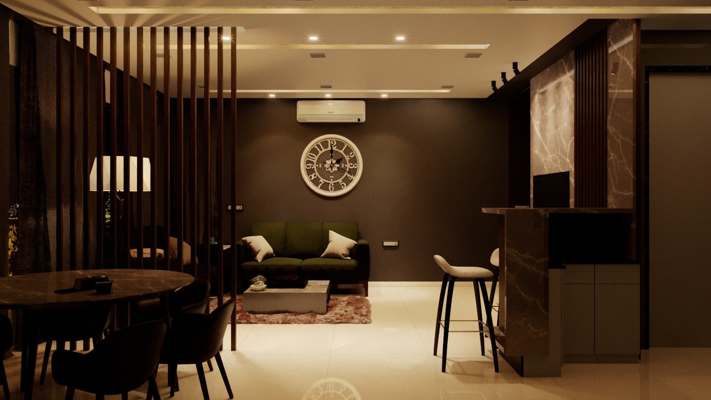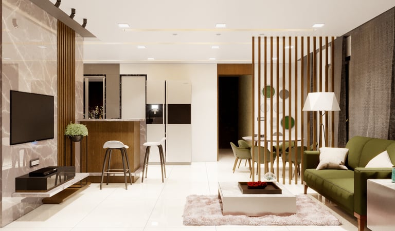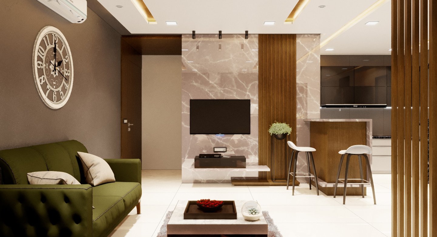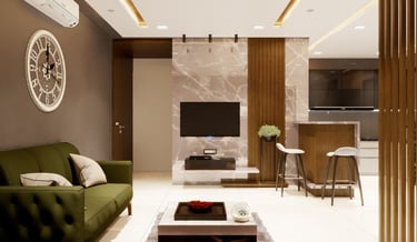 The seamless flow between living, dining, and kitchen areas makes the space highly functional yet visually refined. A marble-finished TV backdrop adds a statement element, complemented by warm wood detailing and layered lighting that creates a cozy yet sophisticated atmosphere.