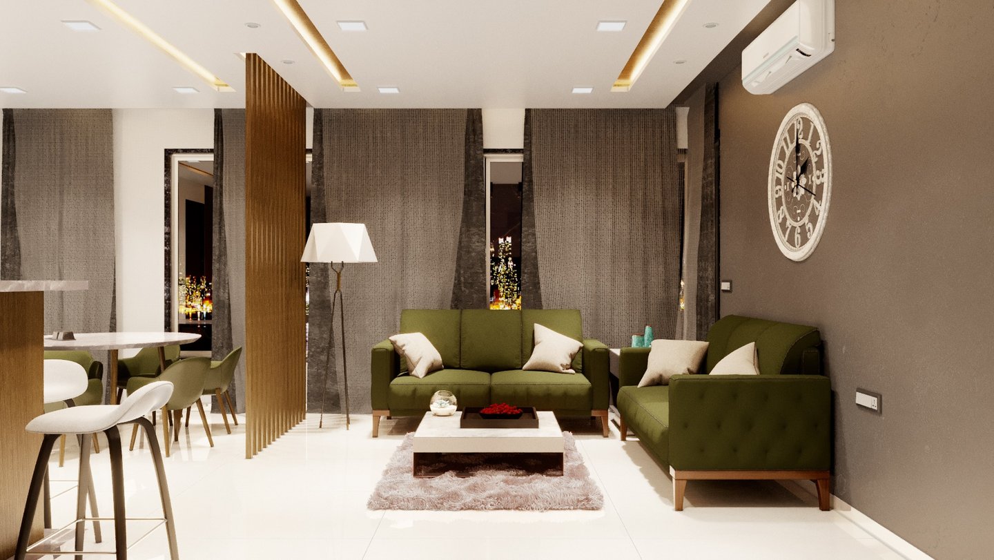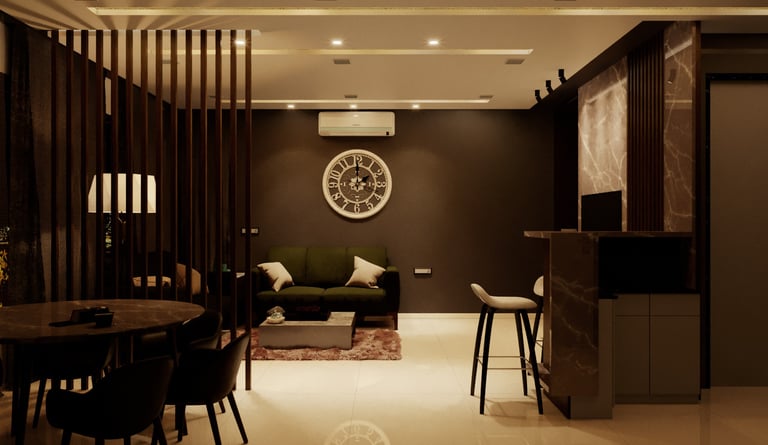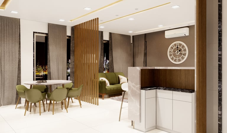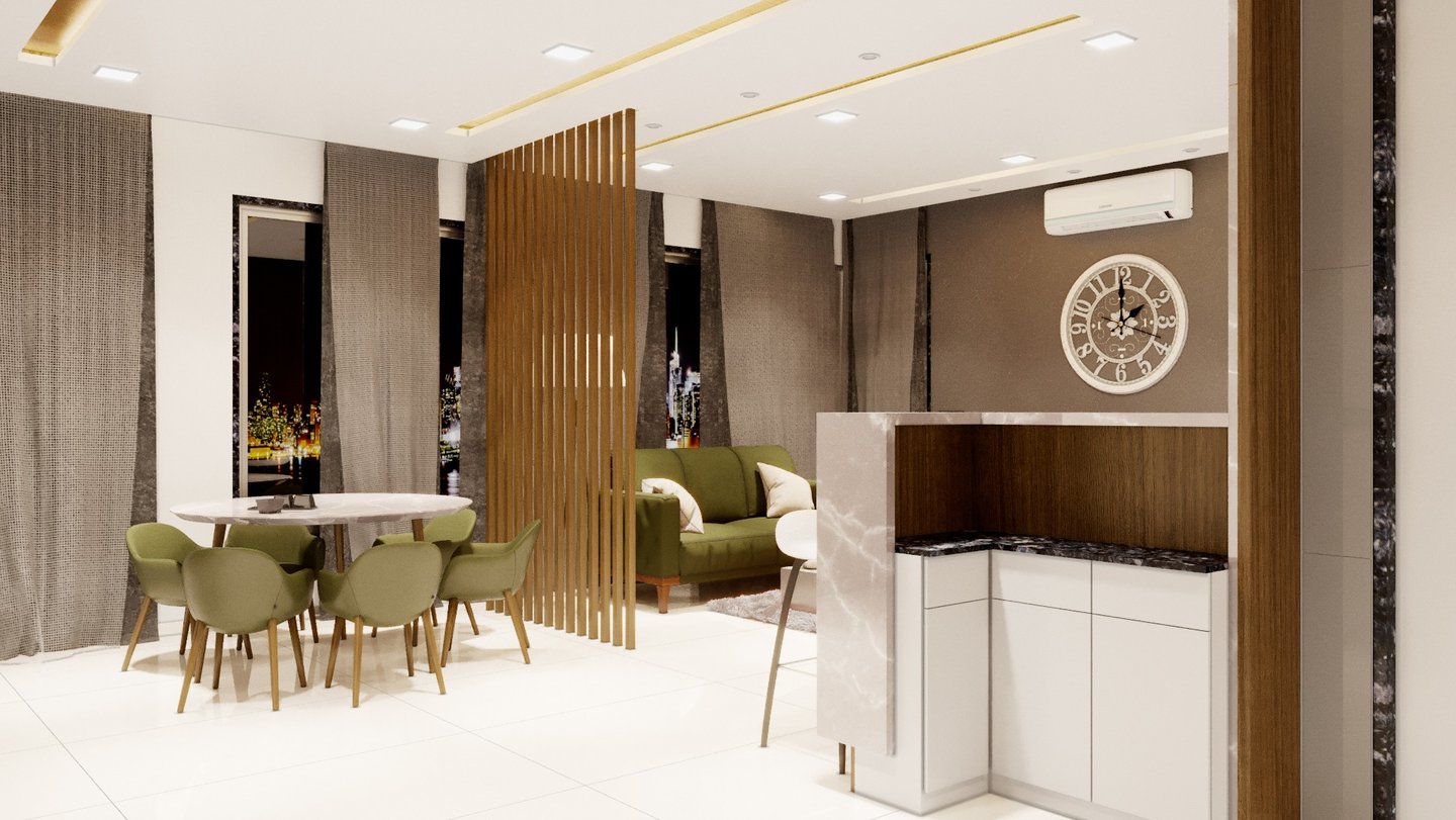 The design brings together olive-toned seating, marble textures, and wooden accents to create depth and balance. Vertical slats subtly divide spaces without breaking the open layout, while soft ceiling lighting enhances the overall ambiance and highlights key features.