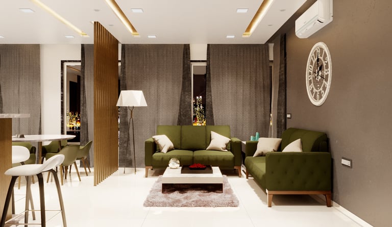 A warm and modern living space designed to combine comfort, elegance, and open functionality.