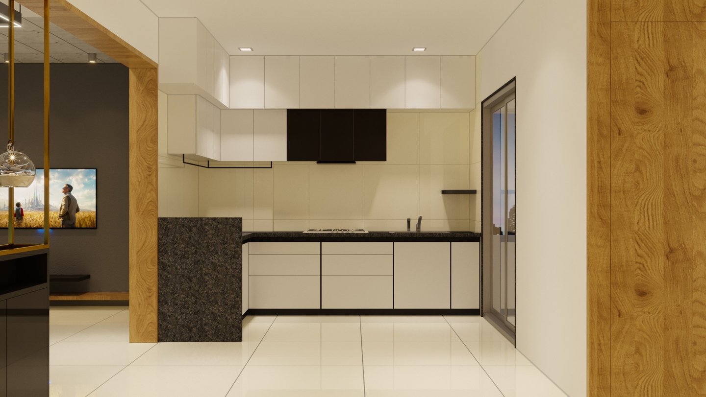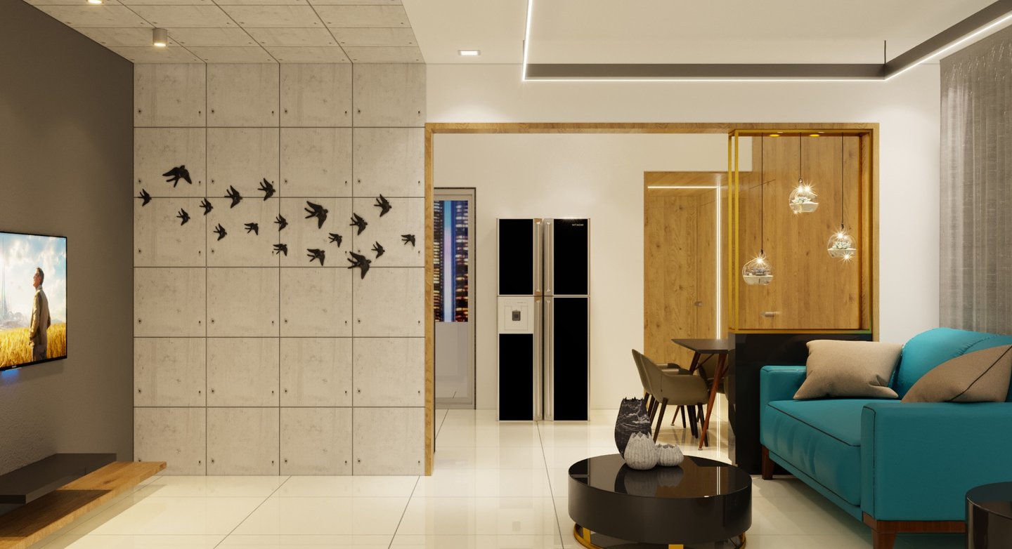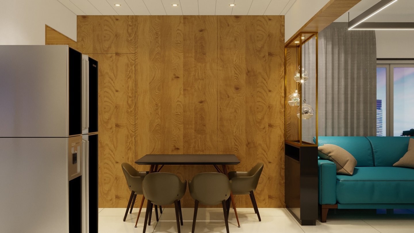 This space features a concrete-textured accent wall that adds depth and an industrial feel, complemented by warm wooden paneling for contrast. The open-plan design ensures smooth flow between the living and dining areas, while pendant lighting and ceiling strip lights create a layered lighting effect. Minimal furniture and sleek finishes maintain a clean, contemporary look while maximizing functionality and comfort.