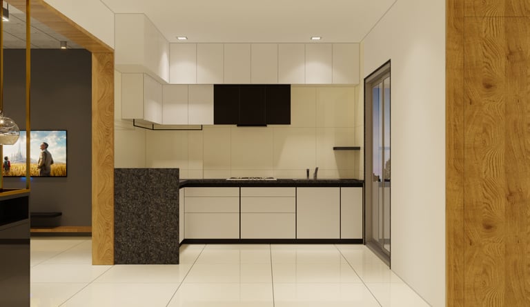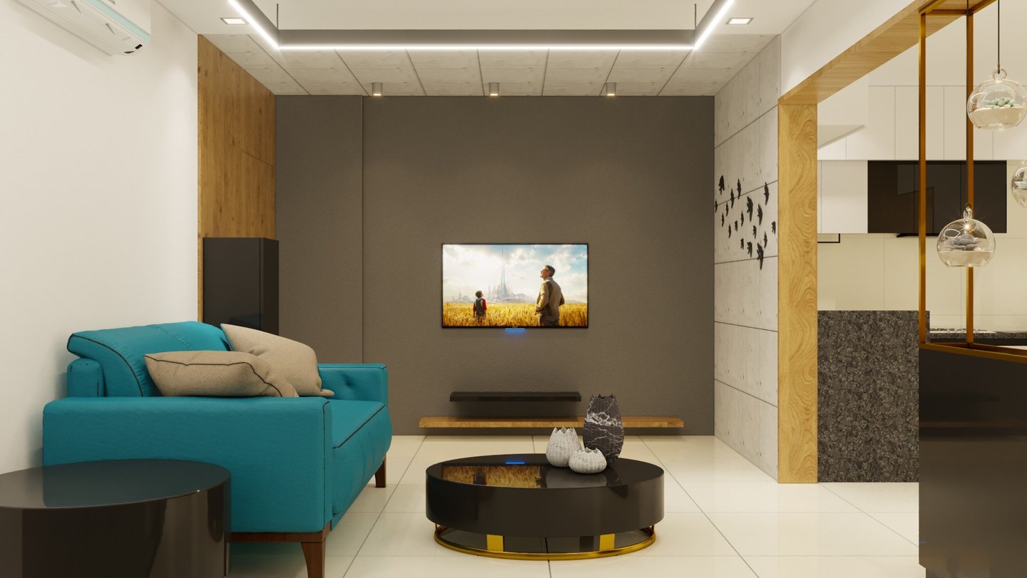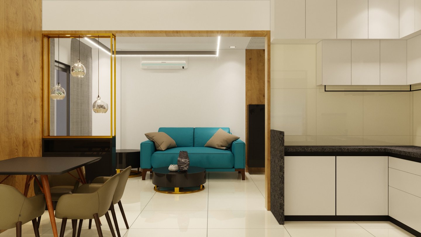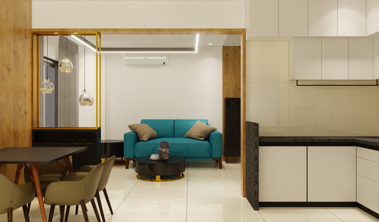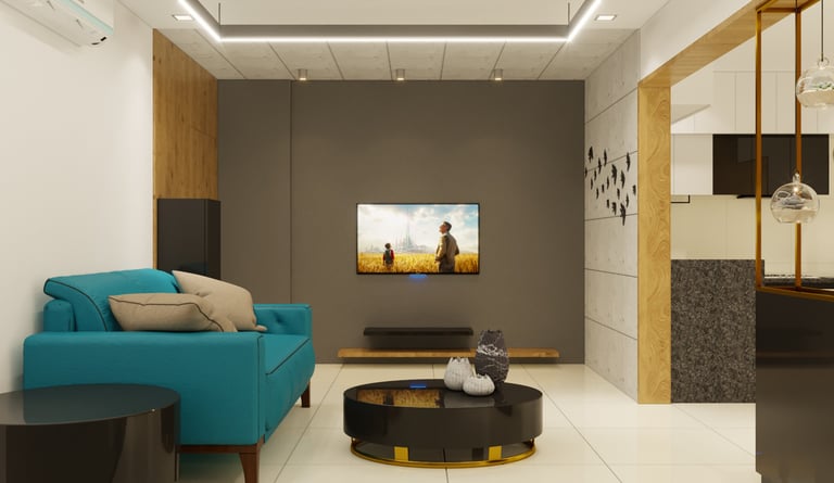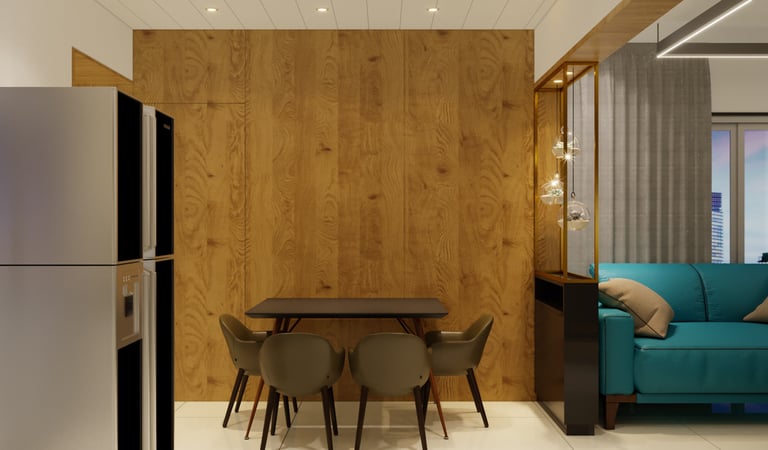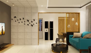 Urban Edge Living is designed to create a bold yet comfortable environment through the combination of concrete finishes, natural wood textures, and striking accent elements. The open layout connects the living and dining areas seamlessly, while clean lines and layered lighting enhance the modern aesthetic. The teal seating adds character, balancing the neutral tones and giving the space a lively touch.